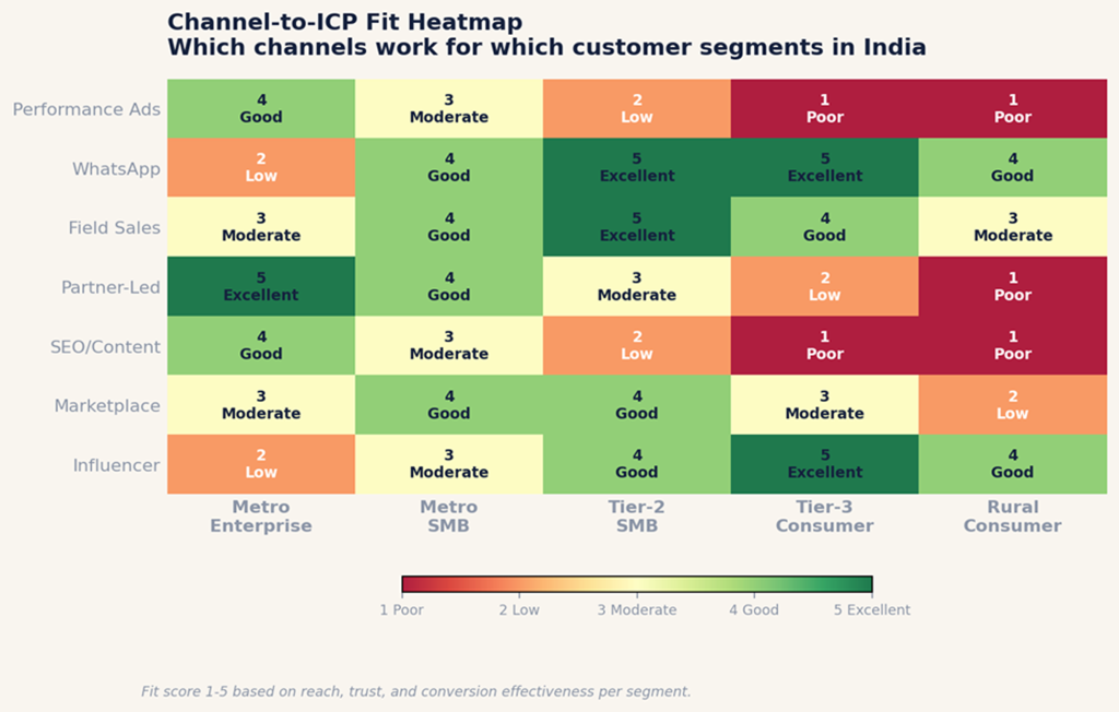In 2026, effective go-to-market strategies in India blend multiple channels: performance marketing, marketplace distribution, partner-led sales, conversational platforms like WhatsApp, and field sales for high-consideration products.